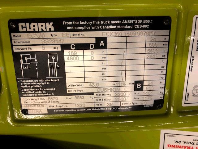 2022 CLARK ECX30 ELECTRIC FORKLIFT